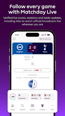Jijumuishe kikamilifu katika ulimwengu unaosisimua wa Ligi Kuu ya Uingereza na programu rasmi ya Premier League. Kuanzia dakika ya kwanza ya mpigo wa filimbi hadi kumbukumbu zisizofutika za miaka thelathini iliyopita, programu hii imeundwa kukuweka karibu na kituo cha matukio kila siku ya msimu. Fuatilia kila mchezo moja kwa moja, dhibiti timu yako ya Fantasy Premier League ukiwa popote, na binafsisha mtiririko wako wa habari ili ulingane na mapenzi yako ya soka. Haijalishi wewe ni shabiki wa aina gani, iwe unatafuta alama za papo hapo au unataka kuzama katika historia tajiri ya ligi, programu ya Premier League ndio lango lako kuu la uzoefu kamili na wa kibinafsi wa soka.